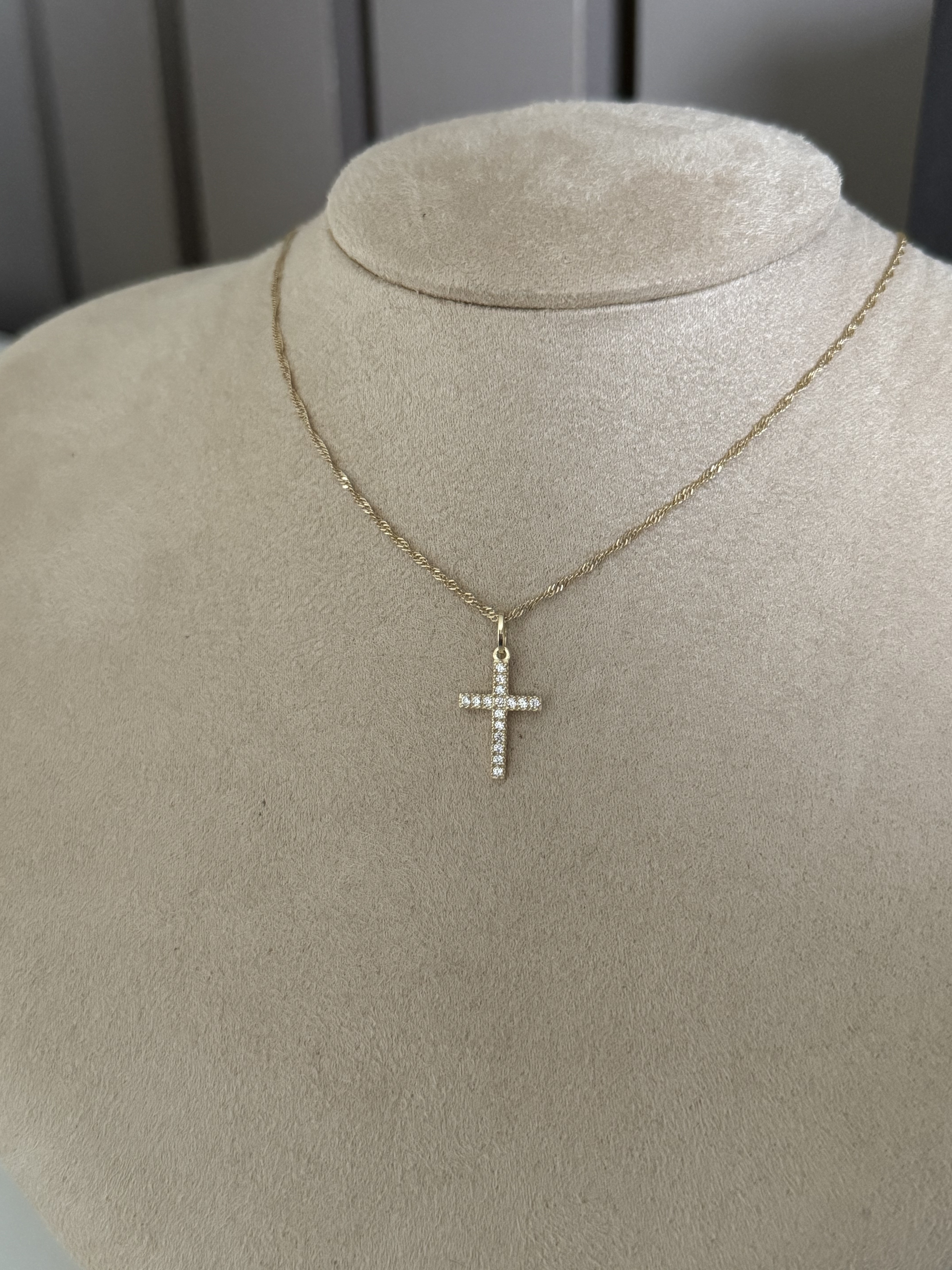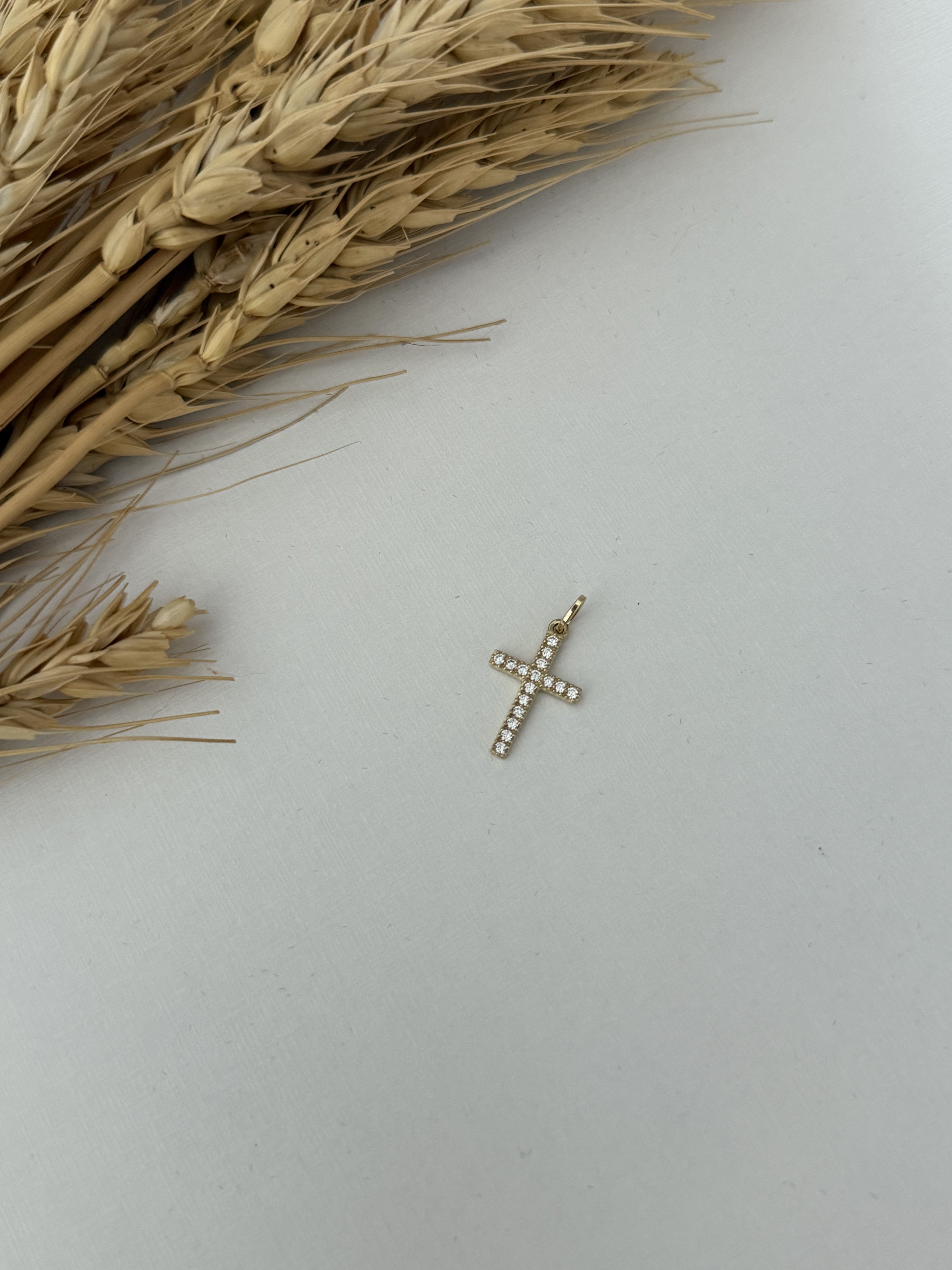 Pingente cruz cravejado com zircônias, com 2cm de altura.