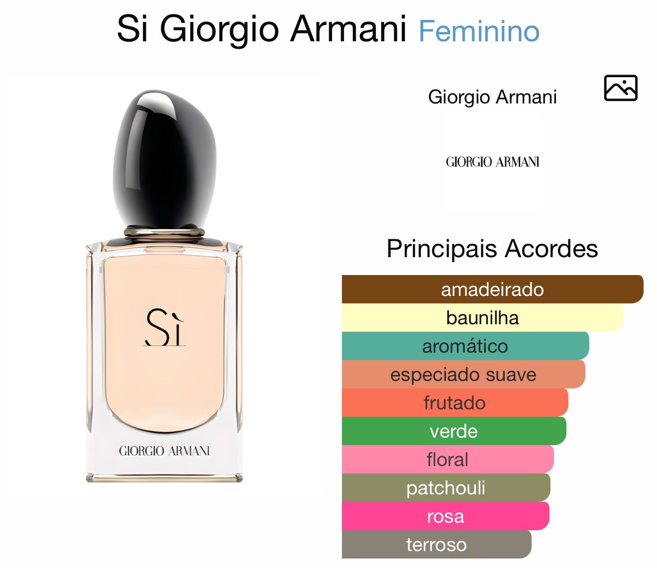 Si de Giorgio Armani é um perfume Chipre Frutado Feminino. Si foi lançada em 2013. O perfumista que assina esta fragrância é Christine Nagel. A nota de topo é Cassis. As notas de coração são: Rosa de Maio e Frésia. As notas de fundo são: Baunilha, Patchouli, Notas Amadeiradas e Ambroxan.