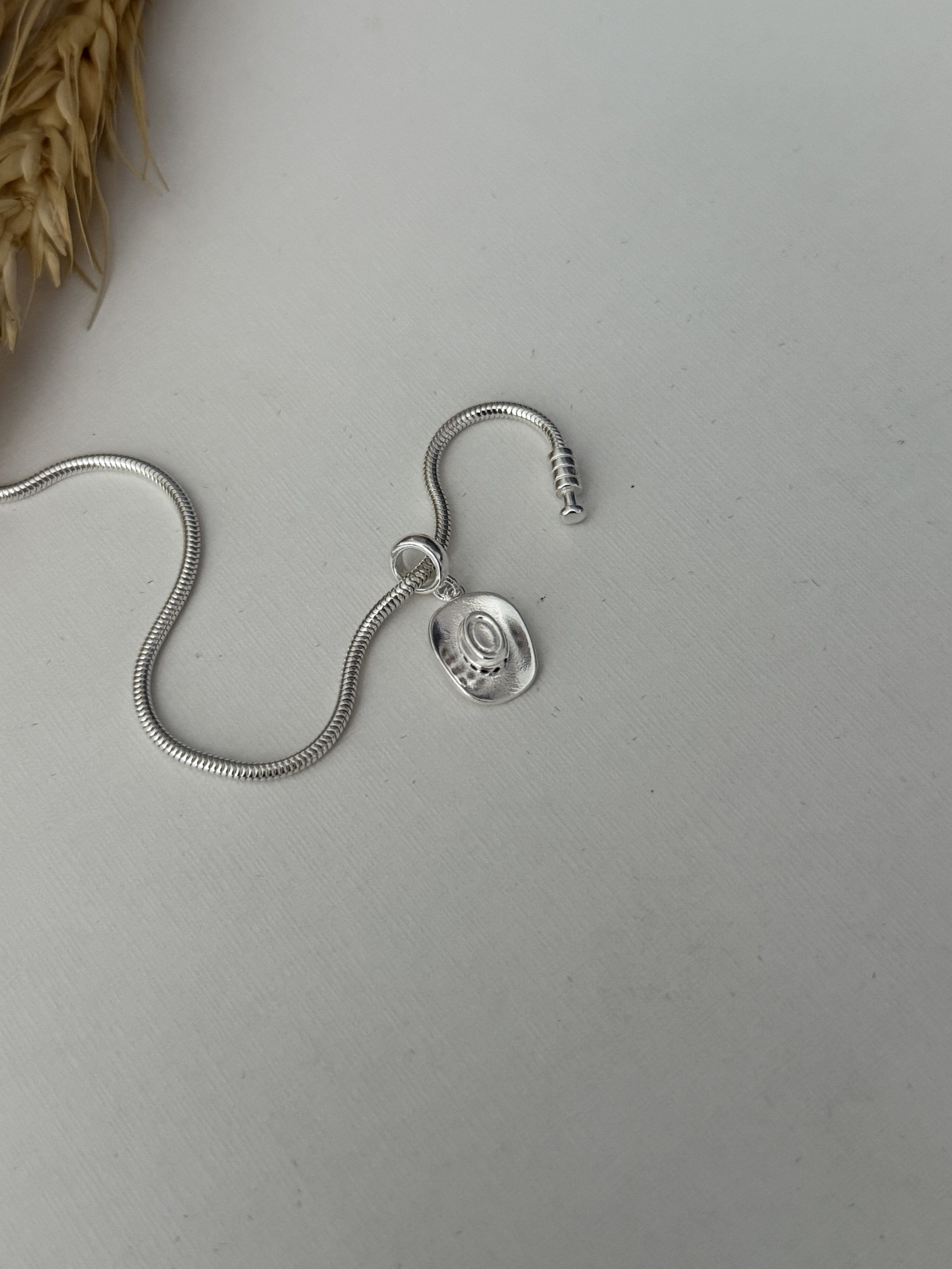 Berloque chápeu, com detalhes cravejados com zircônia rosa.